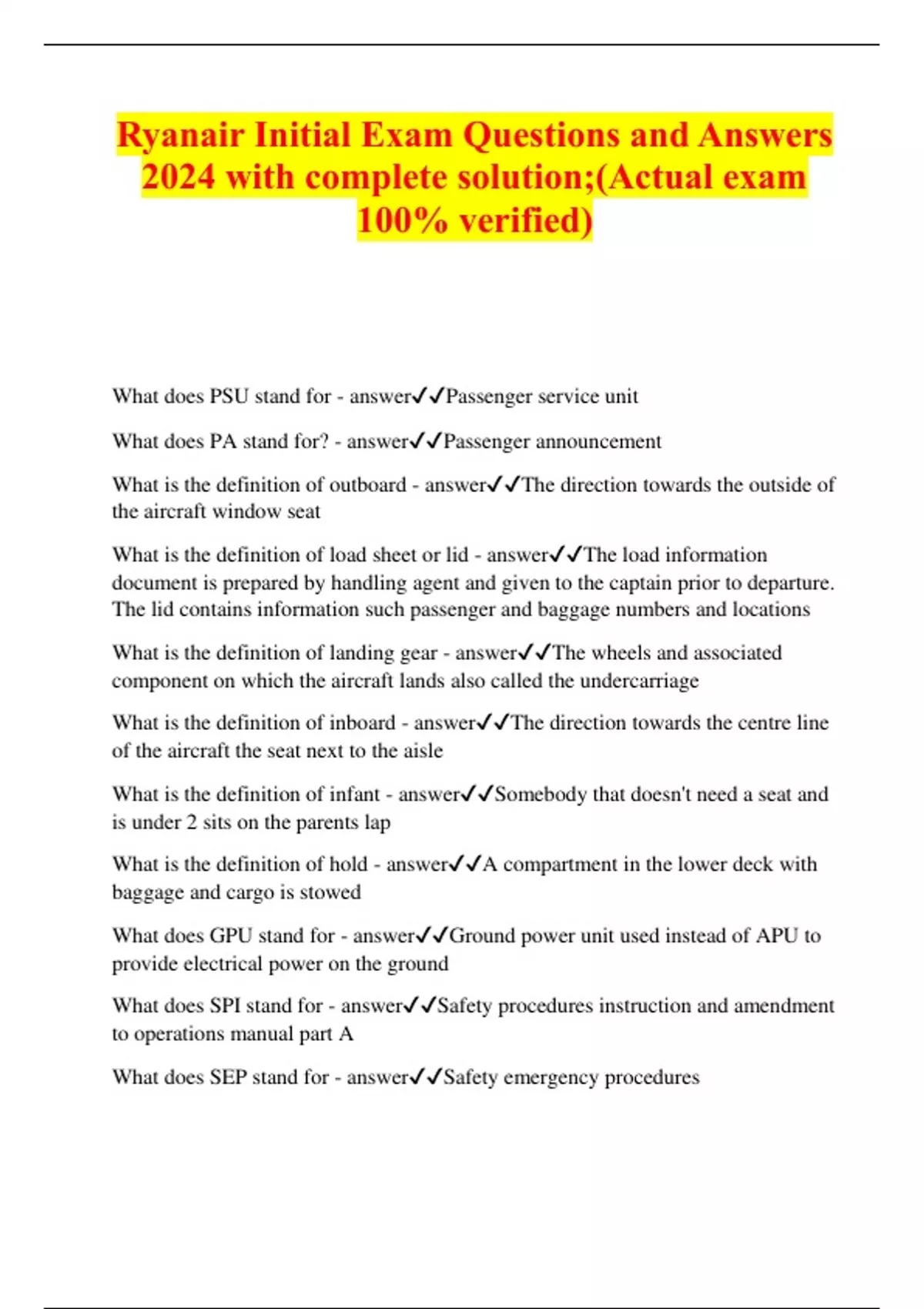 Ryanair Initial Exam Questions and Answers 2024 with complete solution;(Actual exam 100% verified)