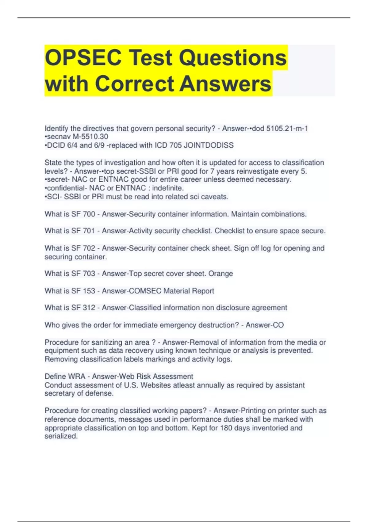 1 Exam (elaborations) OPSEC Fundamentals Final Exam Questions and Answers 2 Exam (elaborations) OPSEC Exam Questions with Correct Answers 3 Exam (elaborations) OPSEC Process Five Steps Exam Questions and Answers 4 Exam (elaborations) OPSEC 2023 Exam Questions with Correct Answers 5 Exam (elaborations) OPSEC Study Guide Questions and Answers All