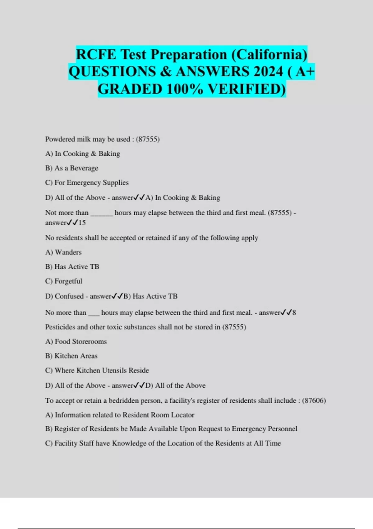 RCFE Test Preparation (California) QUESTIONS & ANSWERS 2024 ( A+ GRADED 100% VERIFIED)