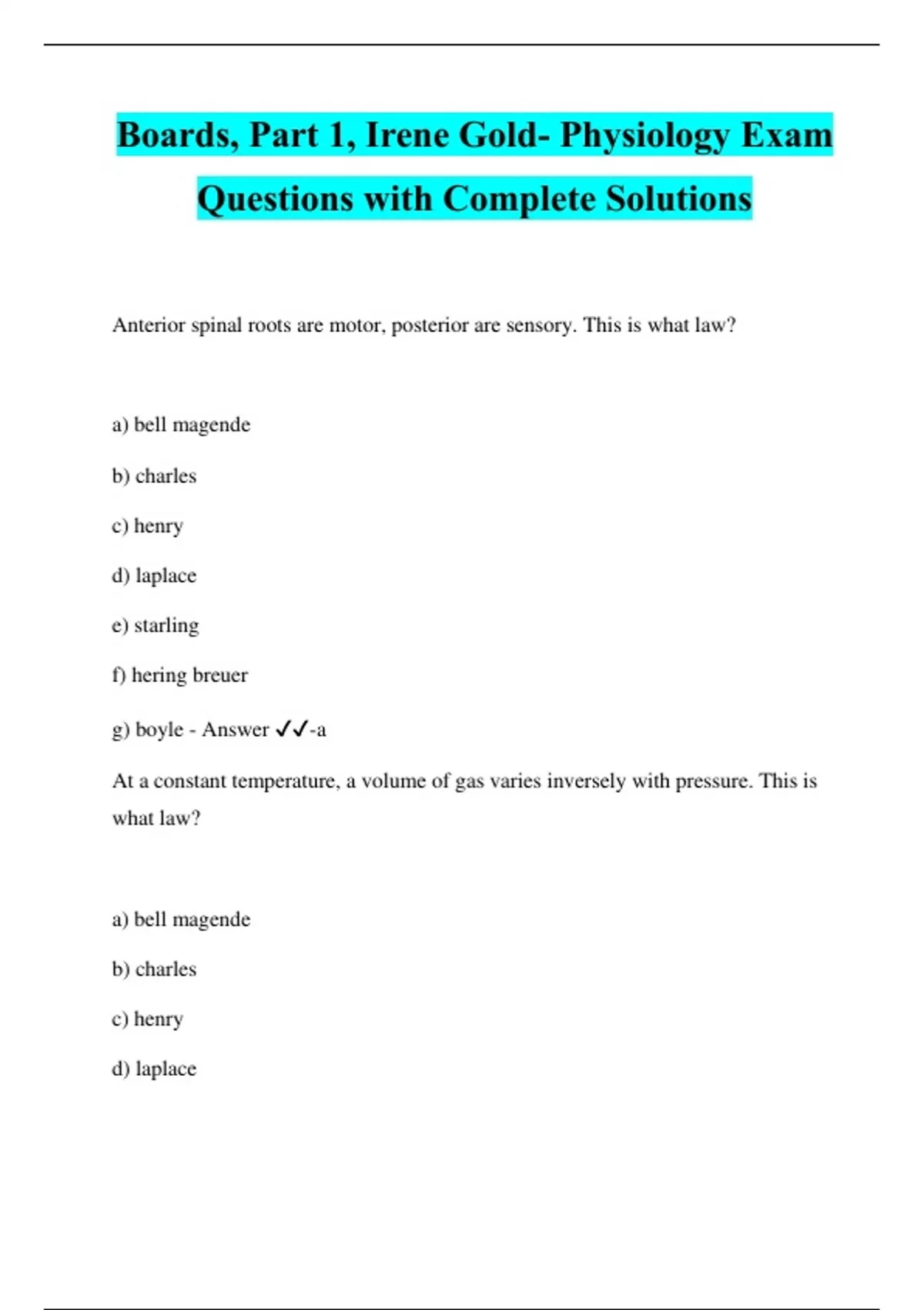 Boards, Part 1, Irene Gold- Physiology Exam Questions with Complete Solutions