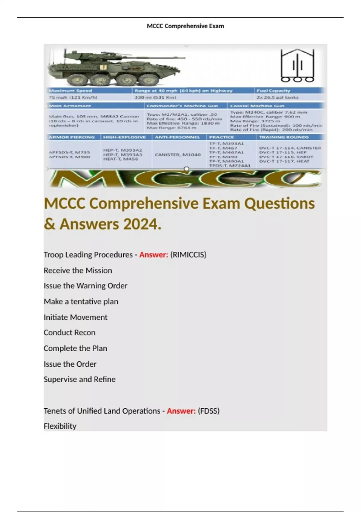 1 Exam (elaborations) MCCC MDMP Study Guide Exam Review Questions (55 terms) with Certified Answers 2024. Terms like: Mission Analysis Key Inputs - Answer: Commander’s Initial Guidance Higher Headquarters plan or order Higher Headquarters intelligence and knowledge produ 2 Exam (elaborations) MCCC MDMP Study Guide Exam Review Questions (55 terms)