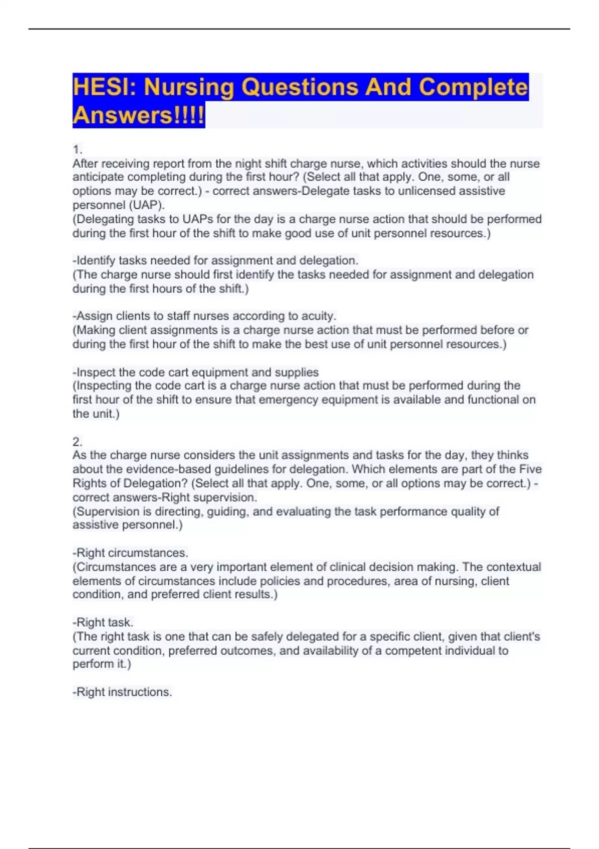 HESI Extensive Questions with Accurate Answers 2023/2024 (Package Deal)