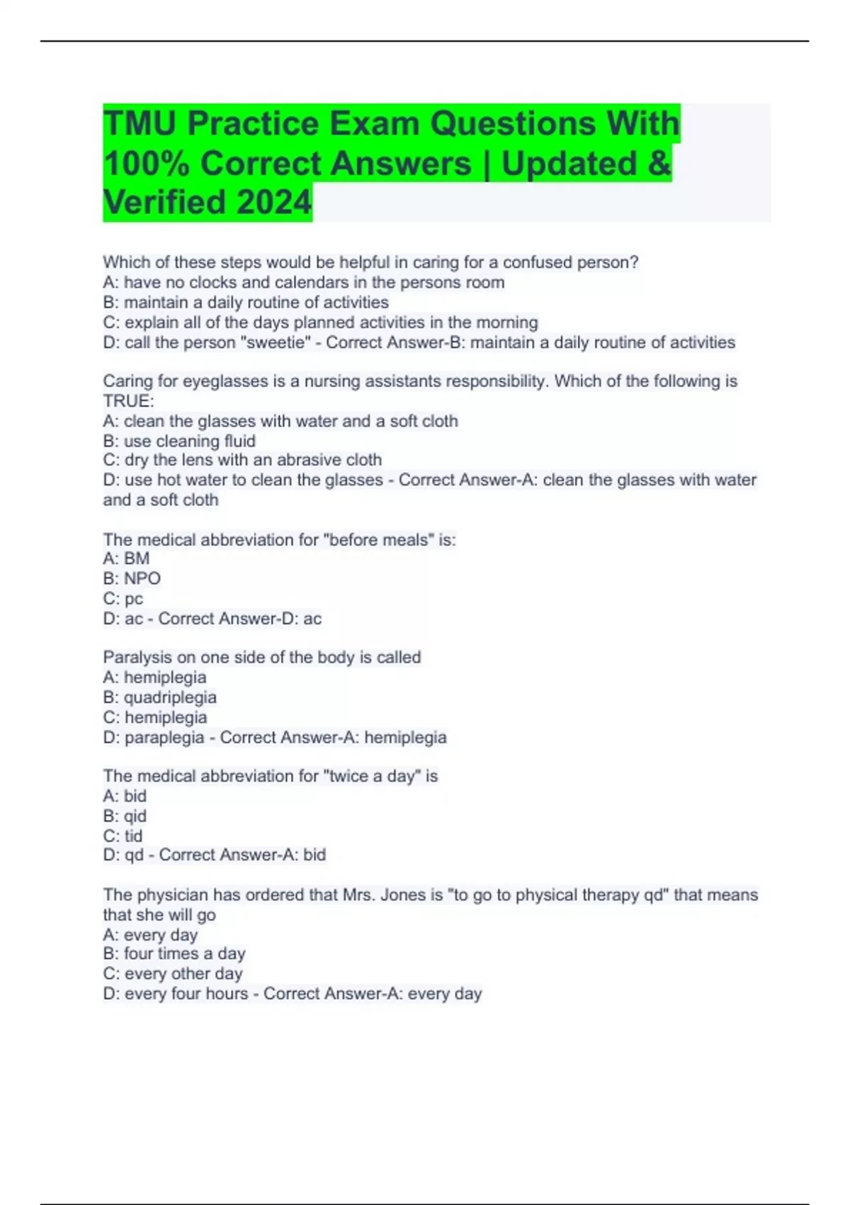 TMU FINAL Exam 5 Questions With 100% Correct Answers | Updated & Verified 2024 TMU Practice Exam Questions With 100% Correct Answers | Updated & Verified 2024 TMU Final Test #1 Questions With 100% Correct Answers 2024 TMU Final Exam # 7 Questions With 100% Correct Answers 2024 TMU BSM 100 Final Exam Questions with 100% Correct Answers | Updated