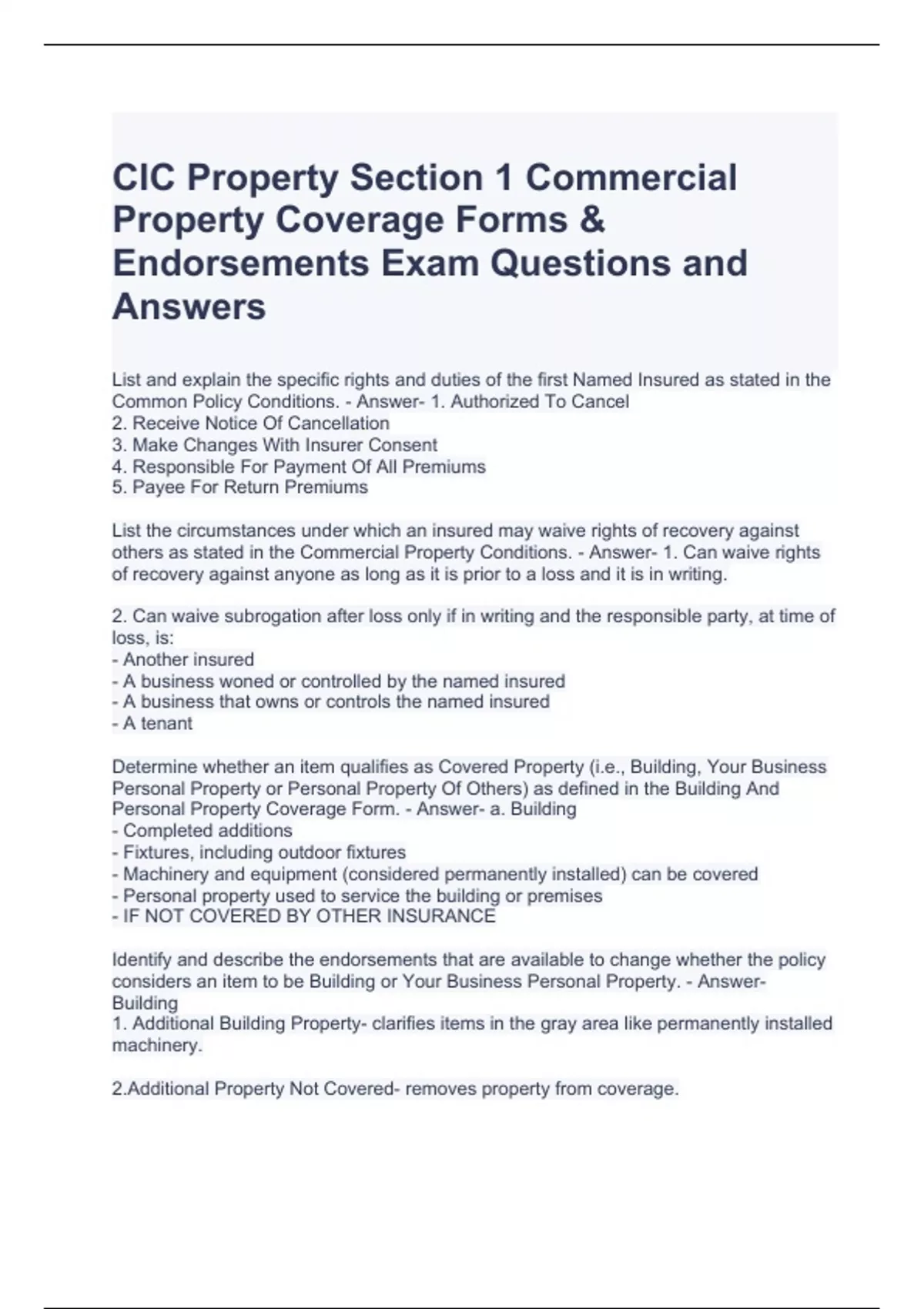 1 Exam (elaborations) CIC Property Section 1 Commercial Property Coverage Forms & Endorsements Exam Questions and Answers 2 Exam (elaborations) CIC Property Exam Questions and Answers 3 Exam (elaborations) CIC Property Exam Questions and Answers 4 Exam (elaborations) CIC Commercial Property Exam Questions with correct Answers 5 Exam (elaboratio
