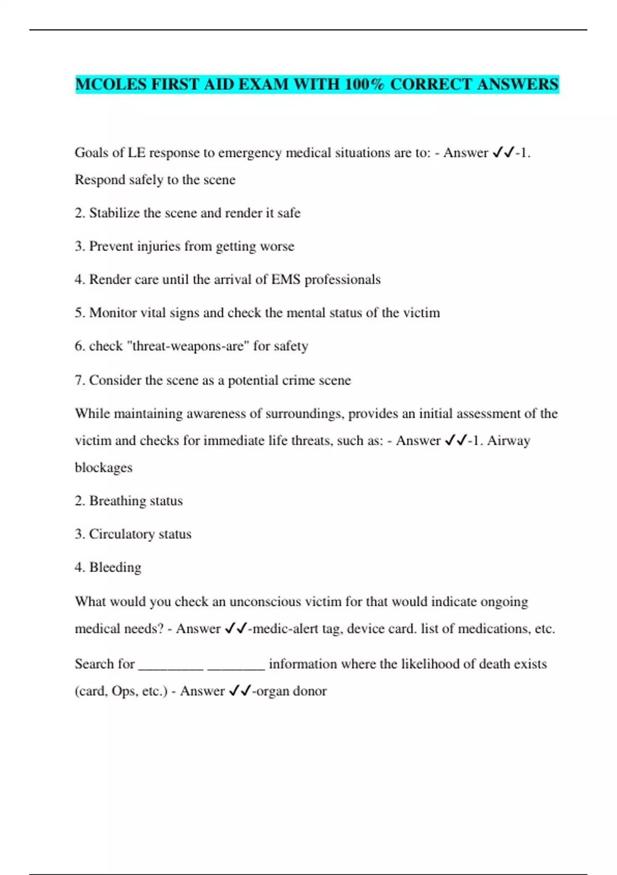 MCOLES FIRST AID EXAM WITH 100% CORRECT ANSWERS
