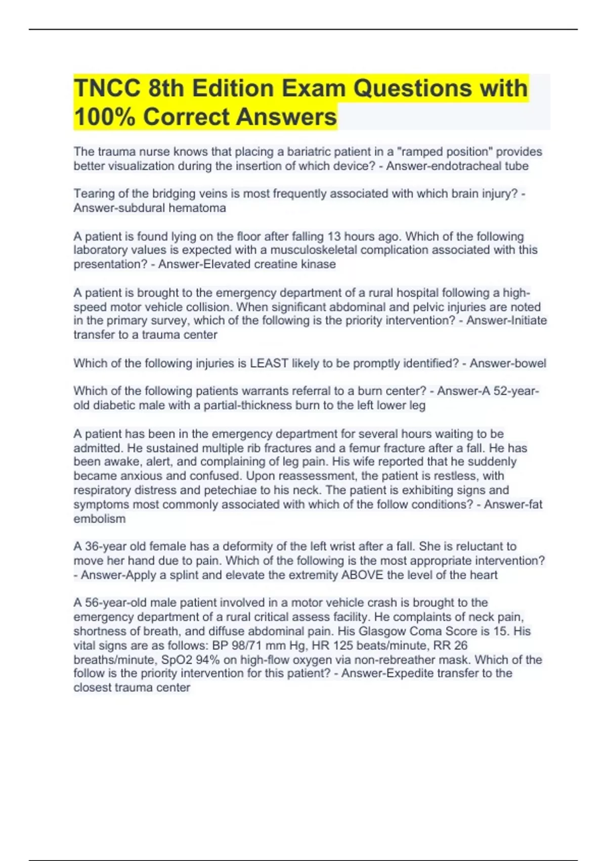 1 Exam (elaborations) TNCC 9th editionTest Prep exam questions with complete solutions 2 Exam (elaborations) Trauma Nursing Process - TNP - TNCC Exam Questions and Answers 3 Exam (elaborations) TNCC Written Exam Questions with 100% Complete Solutions 2023/2024 4 Exam (elaborations) TNCC Trauma Nursing Core Course Exam Questions with Complete Sol