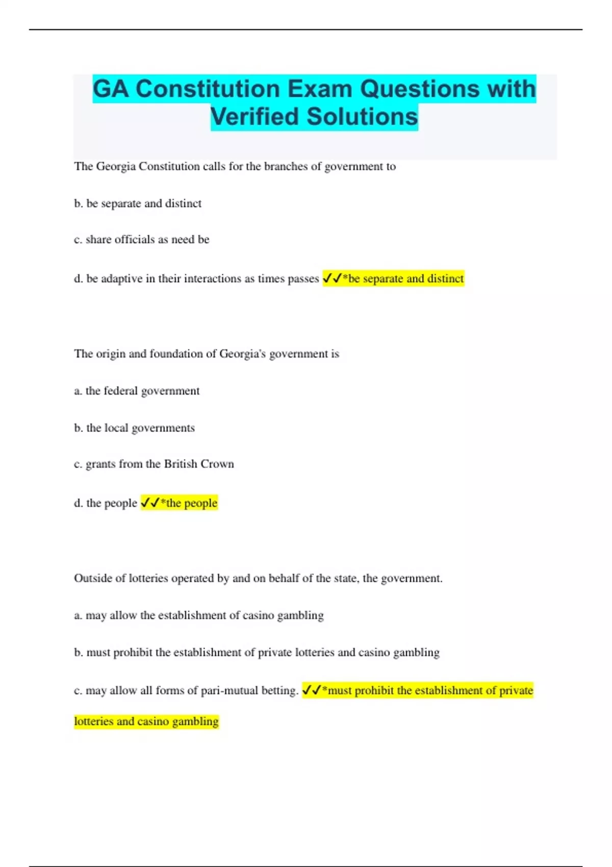 Georgia Constitution Bundled Exams Questions and Answers Multiple Versions (2023/2024) (Complete and Accurate)