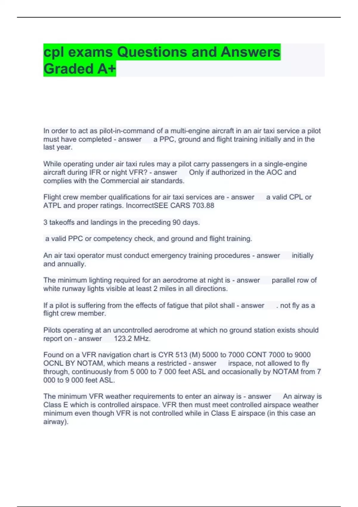 Exam (elaborations) RADIOTELEPHONY - CAAP CPL QUESTIONS AND ANSWERS LATEST UPDATED 2024 Exam (elaborations) General Knowledge - CPL Questions and Answers 100% Accurate 2024 Exam (elaborations) CPL-General Knowledge Questions and Answers Graded A+ 2024 Exam (elaborations) CPL Theory of Flight Questions with complete solutions 2024 Exam (ela