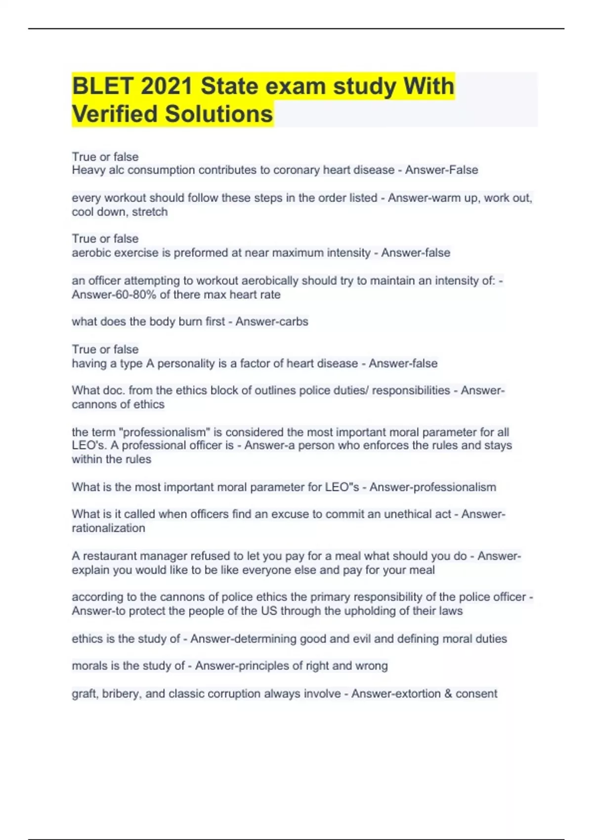 Exam (elaborations) BLET 2021 State exam study With Verified Solutions 2 Exam (elaborations) NC BLET 2020: Driver Training Exam Question with Verified Correct 3 Exam (elaborations) NC BLET 2020: Final Exam Review WITH VERIFIED ANSWERS 4 Exam (elaborations) NC BLET Field Interview and Interrogation Exam Questions with Correct Answers 5 Exam (ela
