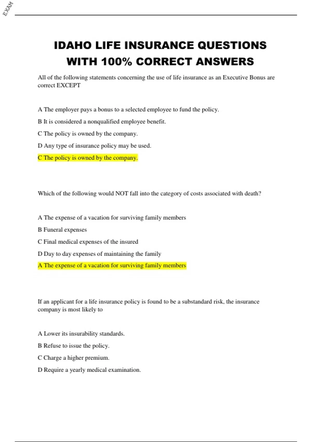 IDAHO LIFE INSURANCE TEST 3 QUESTIONS WITH 100% CORRECT ANSWERS