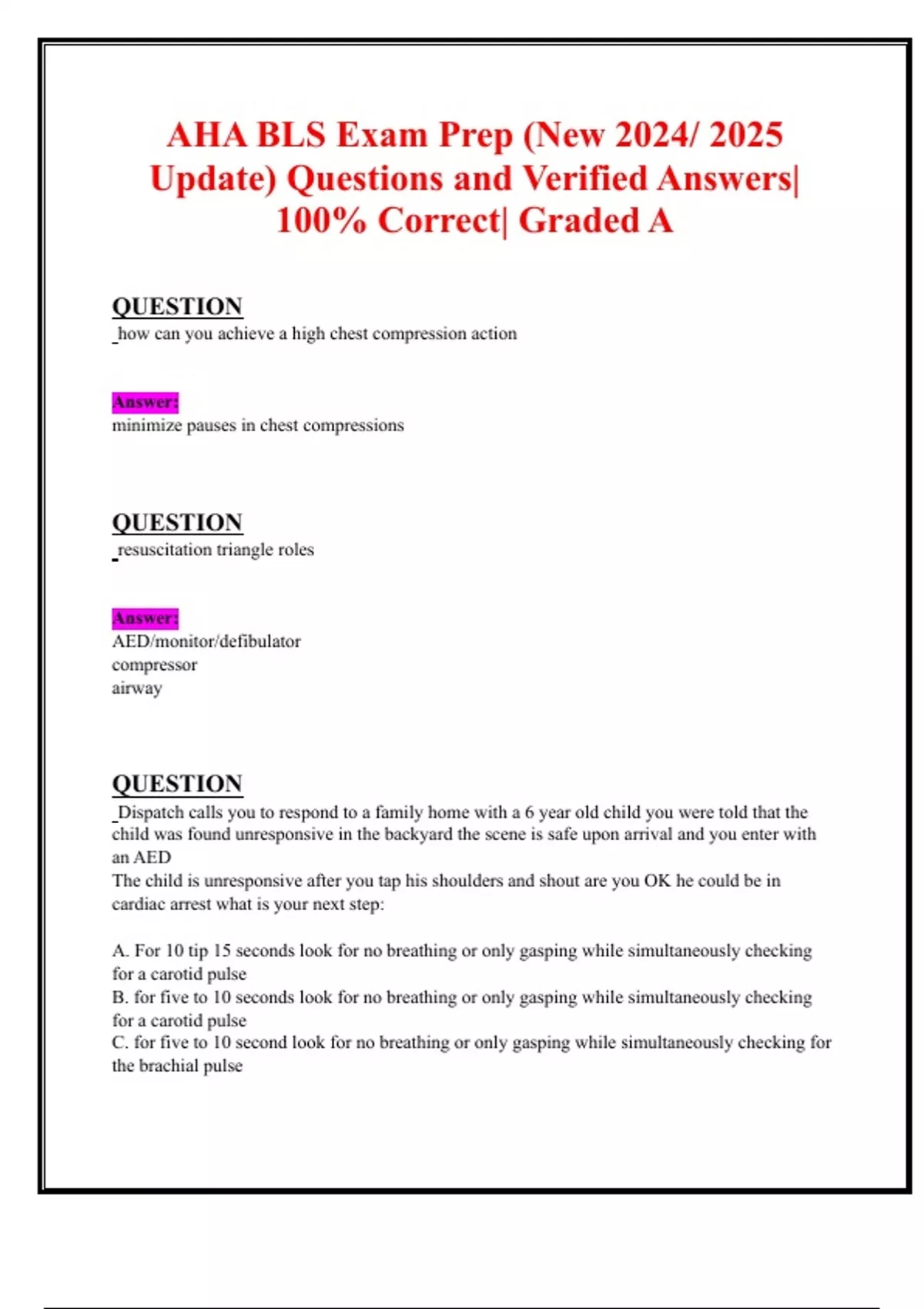 AHA BLS Exam Prep (New 2024/ 2025 Update) Questions and Verified Answers| 100% Correct| Graded A