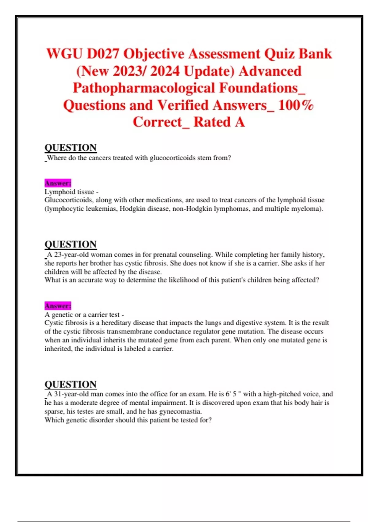 WGU D027 Objective Assessment Quiz Bank (New 2023/ 2024 Update) Advanced Pathopharmacological Foundations_ Questions and Verified Answers_ 100% Correct_ Rated A
