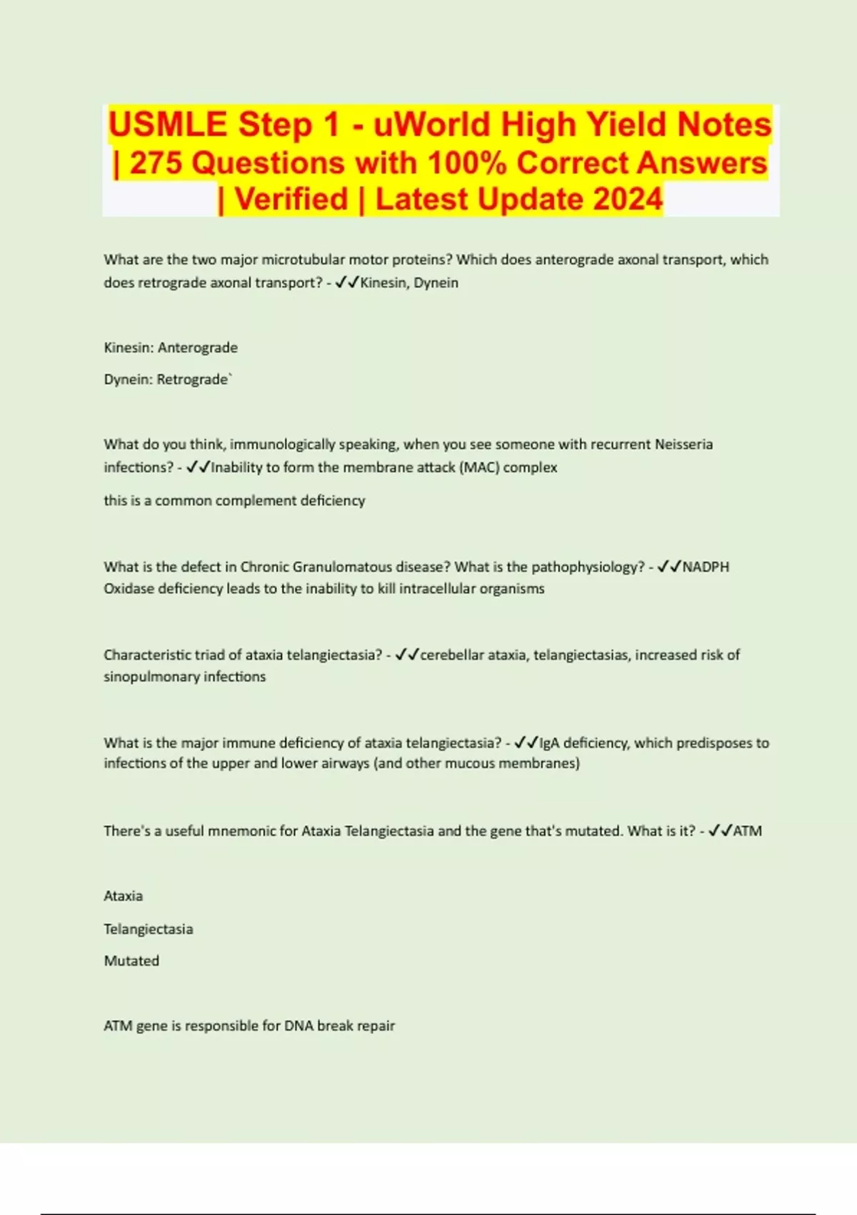 USMLE Step 1 - uWorld High Yield Notes | 275 Questions with 100% Correct Answers | Verified | Latest Update 2024