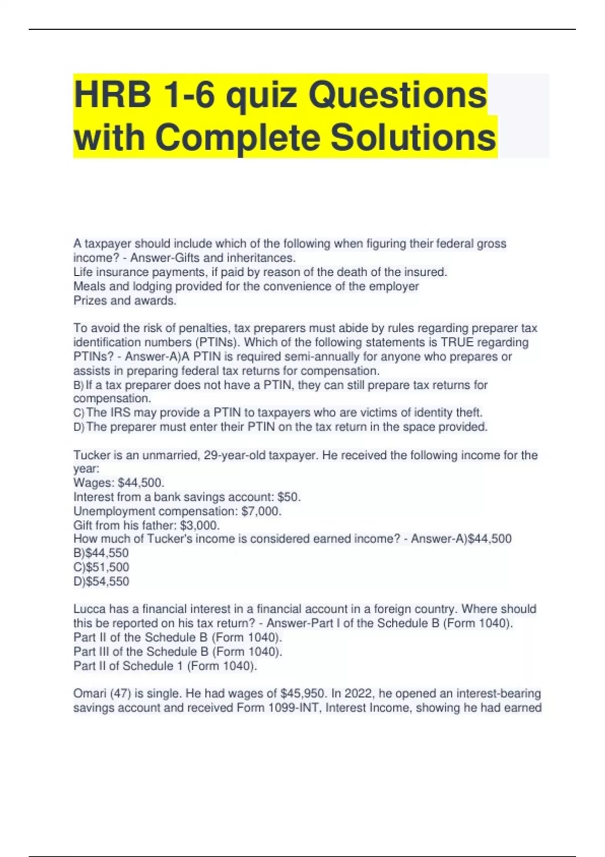HRB-27 Final Exam Review Questions and Answers 2 Exam (elaborations) HRB Test Questions with Correct Answers 3 Exam (elaborations) HRB Midterm Exam Questions with Correct Answers 4 Exam (elaborations) HRB FINAL EXAM QUESTIONS AND ANSWERS ALL CORRECT 5 Exam (elaborations) HRB Chapter 9 Test Questions with Correct Answers 6 Exam (elaborations) H