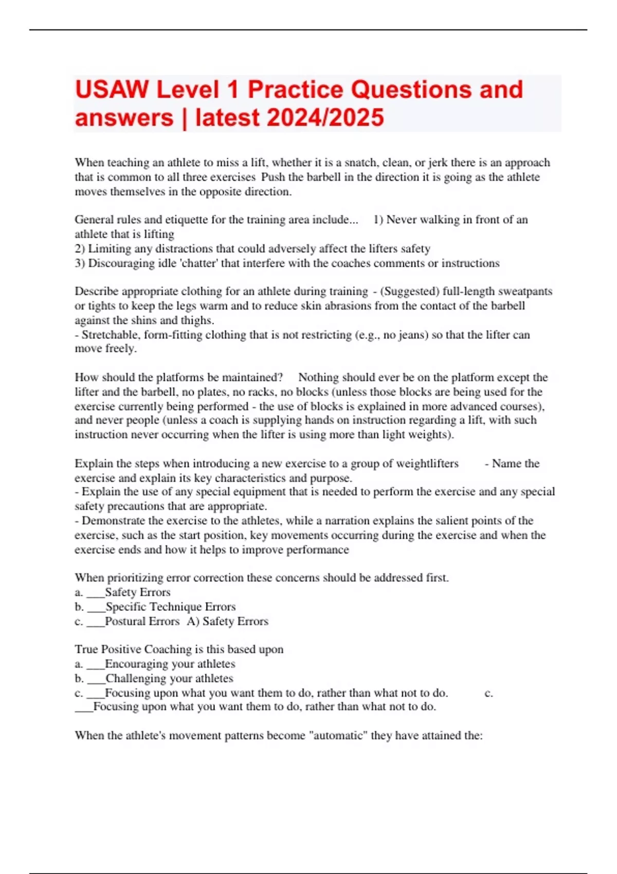USAW Level 1 Practice Questions and answers | latest 2024/2025 USAW CERT. | QUESTIONS AND ANSWERS | LATEST 2024/25 USAW Study Materials | with complete solution | Latest 2024/2025