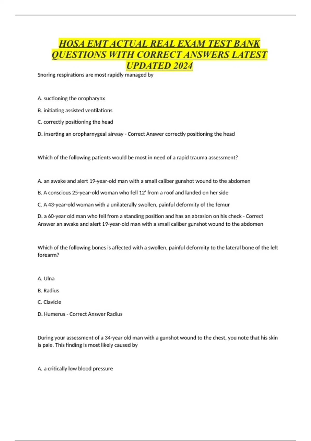 HOSA EMT ACTUAL REAL EXAM TEST BANK QUESTIONS WITH CORRECT ANSWERS LATEST UPDATED 2024, HOSA EMT 430 Questions with Correct Answers 100% Verified 2024, HOSA EMT Questions with Correct Answers 100% Verified Latest Updated 2024, HOSA EMT PRACTICE TEST QUESTIONS WITH 100% VERIFIED CORRECT ANSWER and HOSA EMT Questions with Correct Answers Graded A+ 2