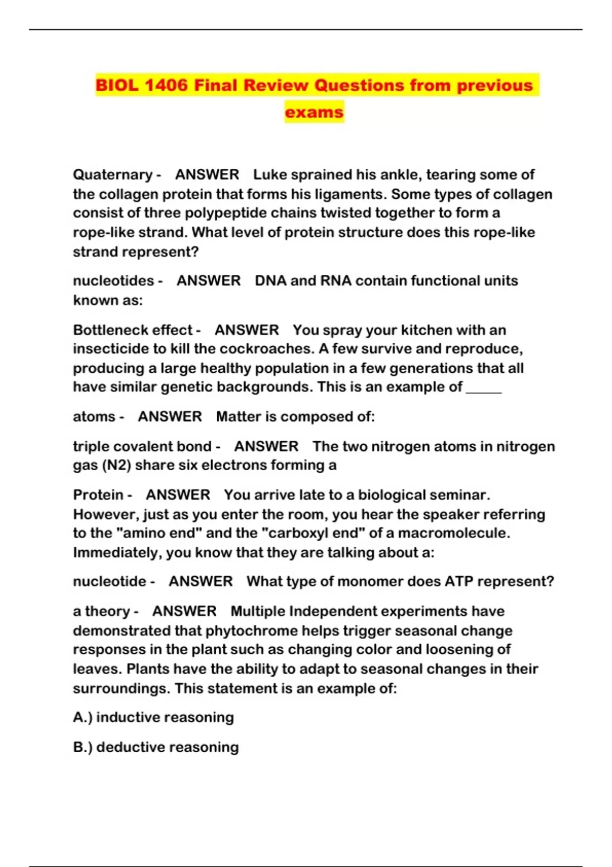 BIOL 1406 EXAM WITH 100 QUESTIONS AND ANSWERS
