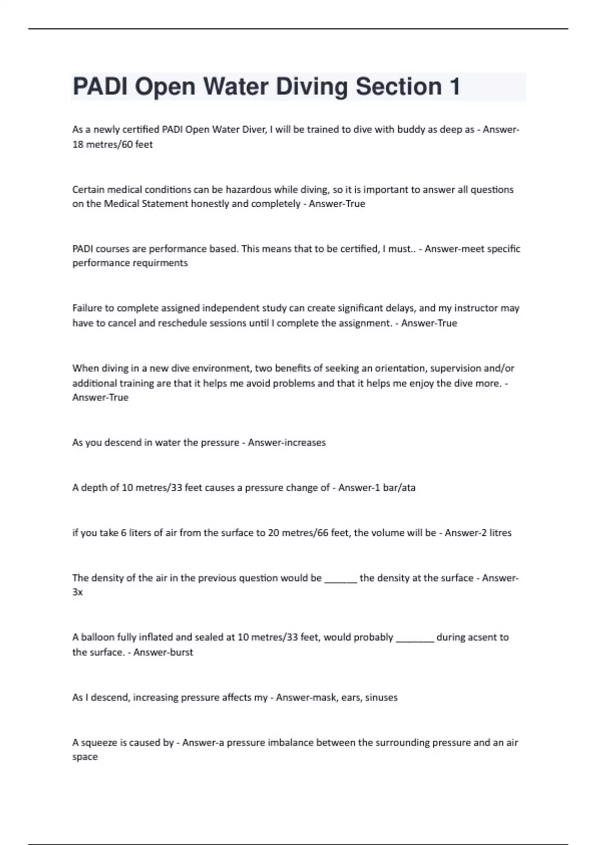 PADI Open Water Diver Certification Questions and Answers Latest [100% correct answers]2024