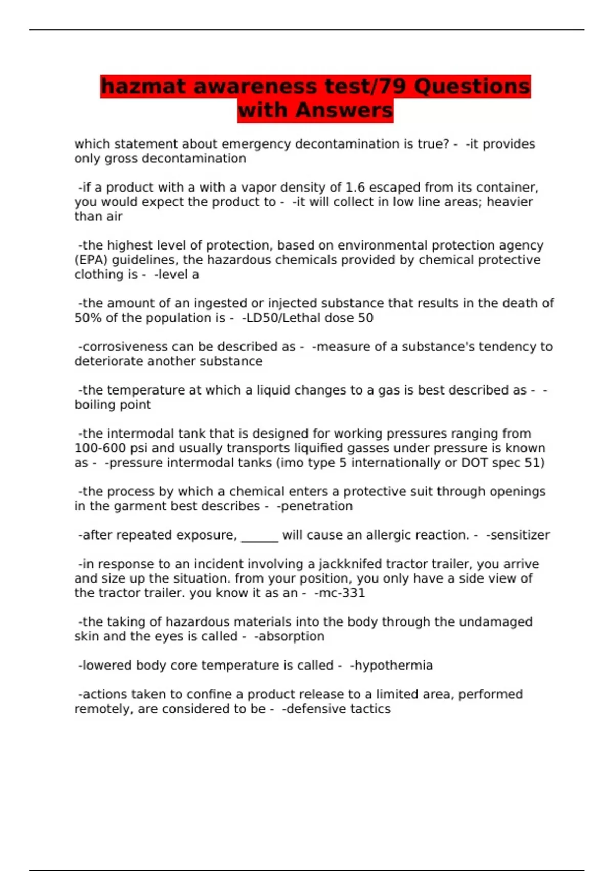 HAZMAT AWARENESS EXAMS - QUESTIONS AND ANSWERS - BUNDLE
