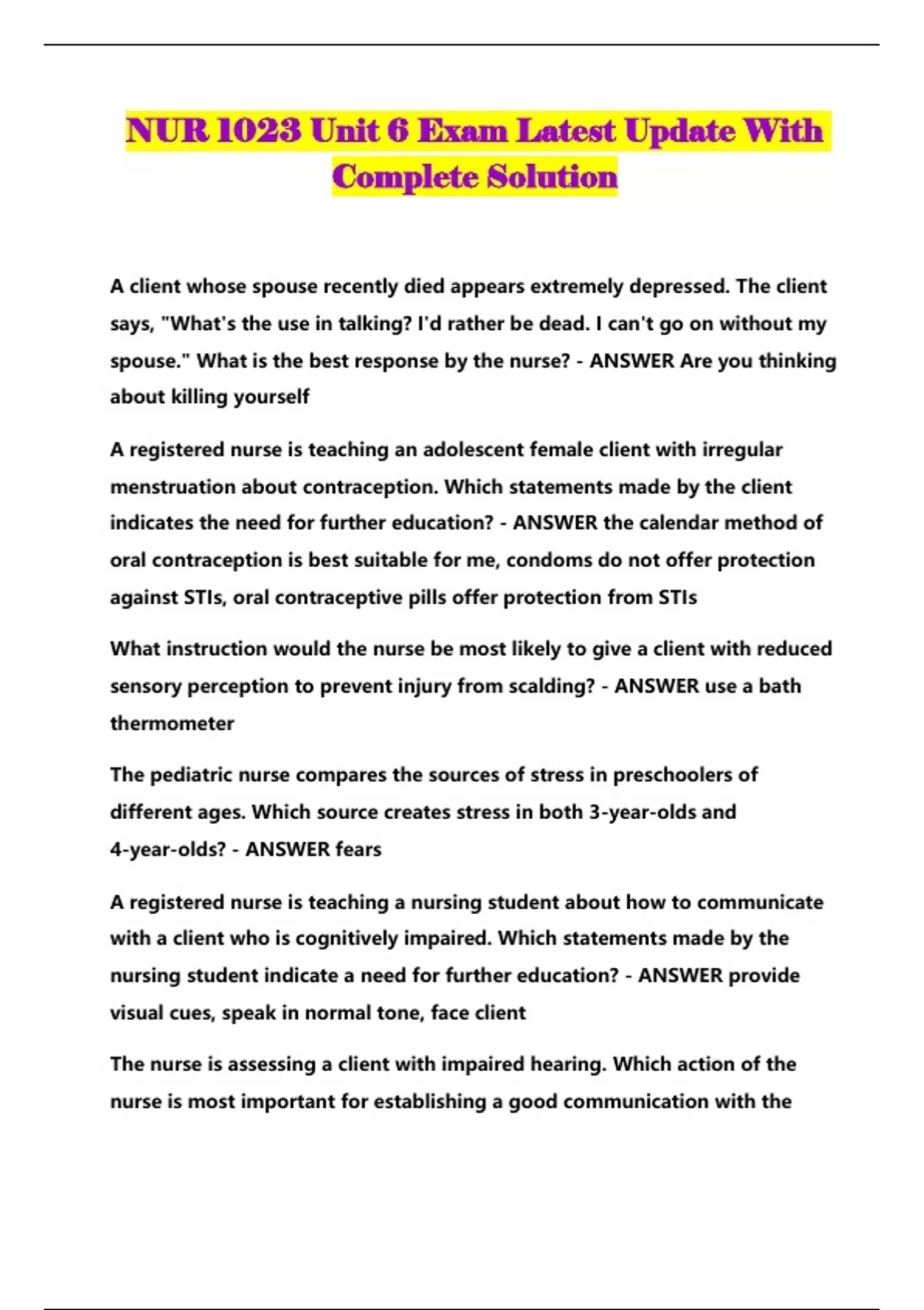 NUR 1023 Unit 6 Exam Latest Update With Complete Solution