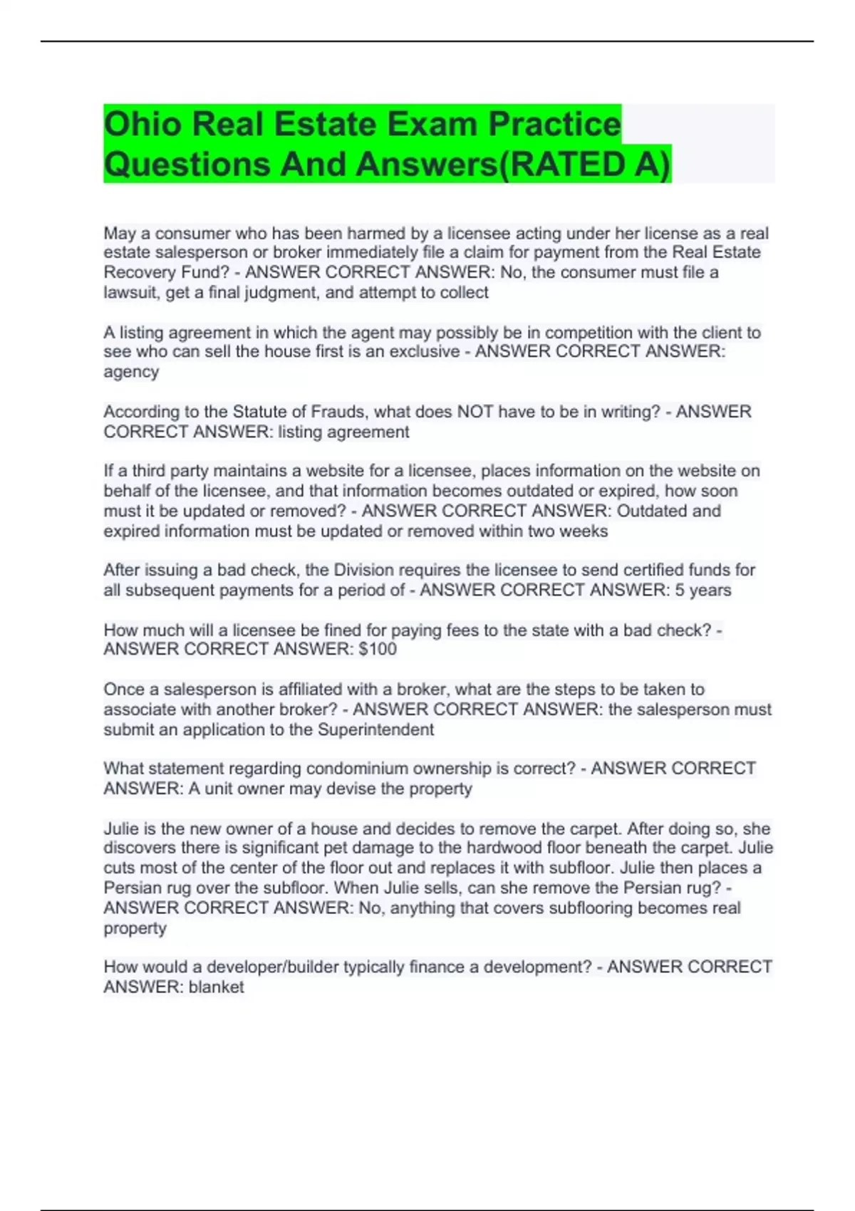 Ohio Real Estate Exam Practice Questions And Answers(RATED A)