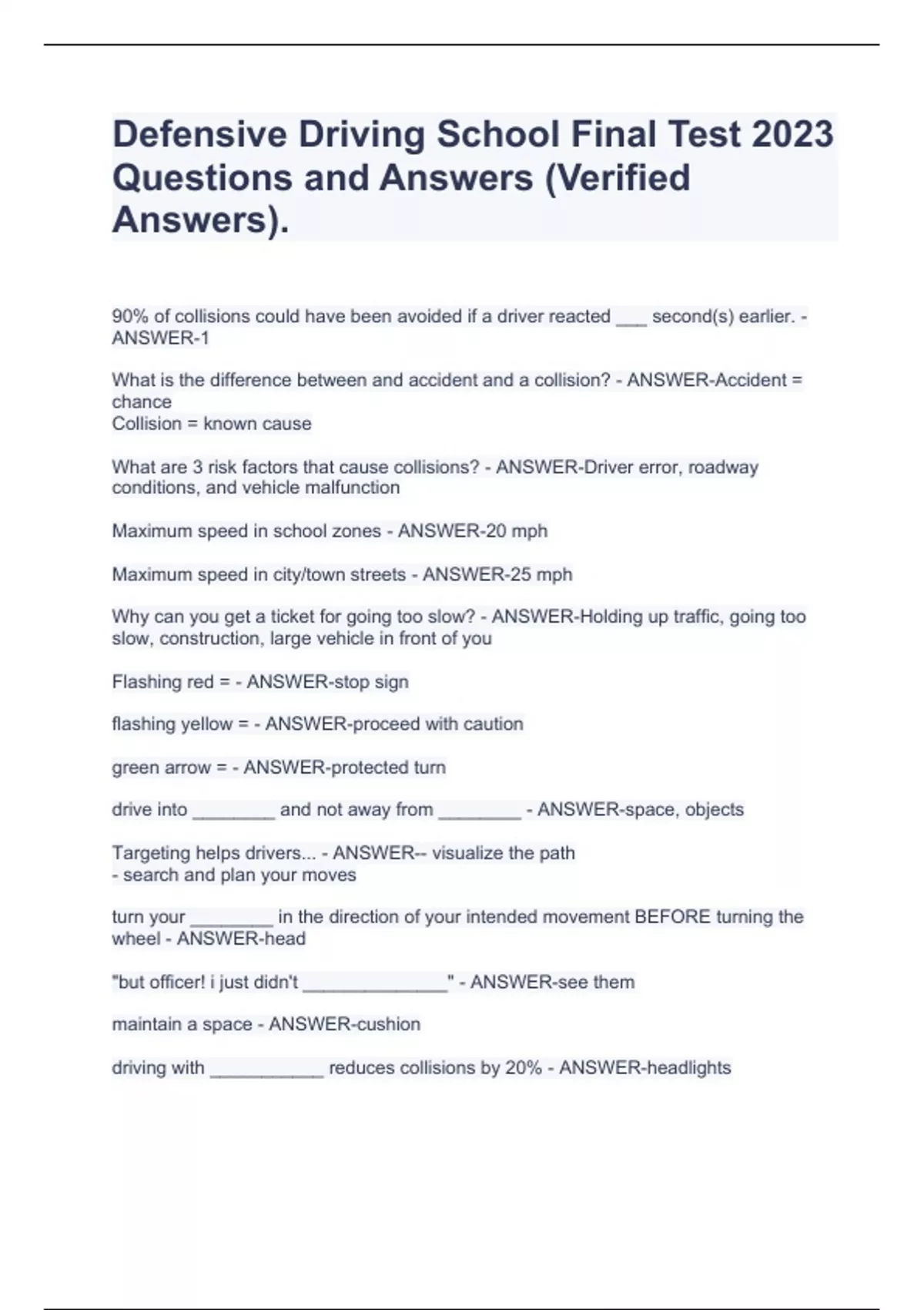 Defensive Driving School Final Test 2023 Questions and Answers (Verified Answers).