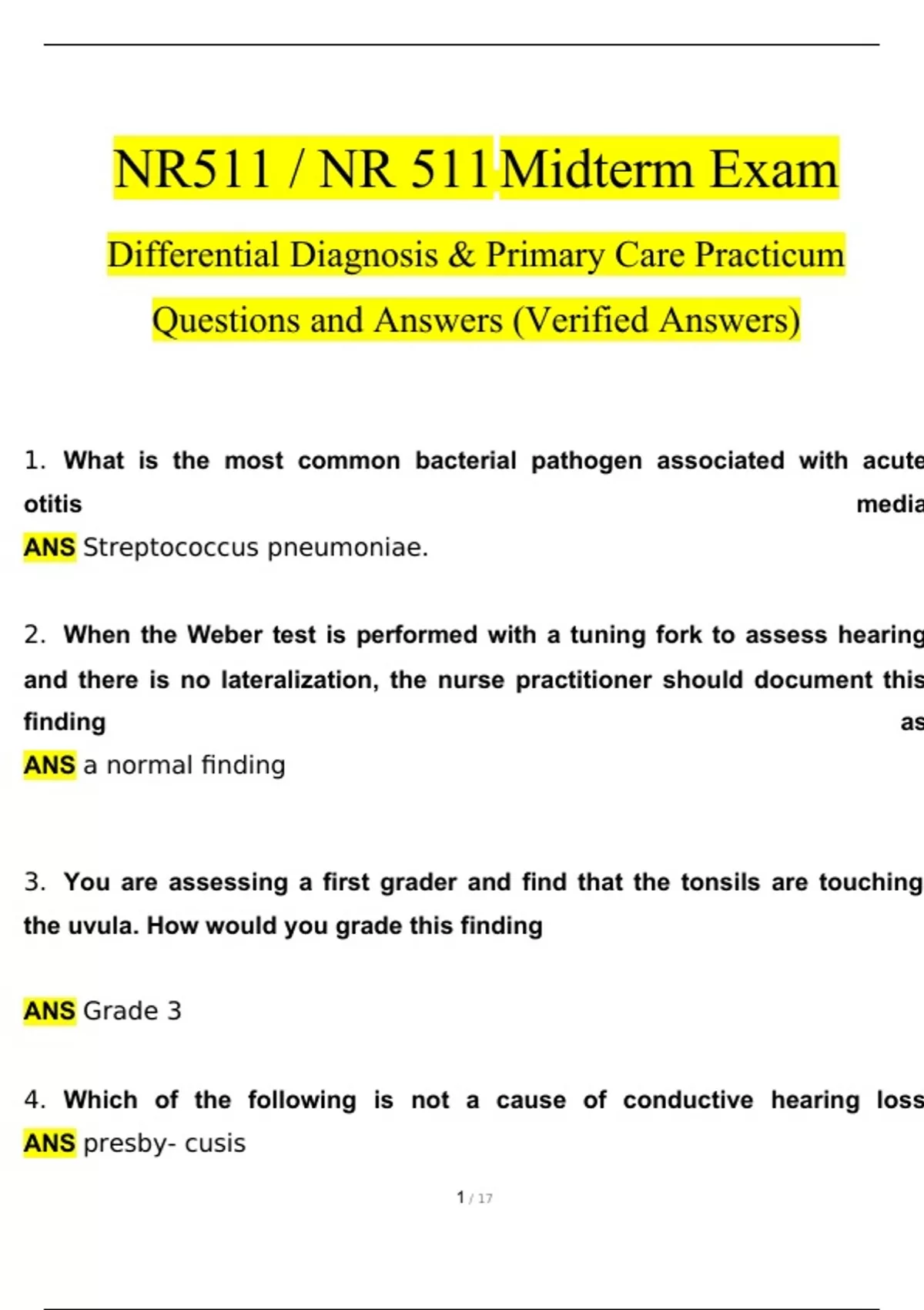 NR511 / NR 511 MIDTERM EXAM & FINAL EXAM STUDY BUNDLE (Latest 2024 / 2025): Differential Diagnosis & Primary Care Practicum (Verified Answers) NR511 / NR 511 MIDTERM EXAM & FINAL EXAM STUDY BUNDLE (Latest 2024 / 2025): Differential Diagnosis & Primary Care Practicum (Verified Answers)