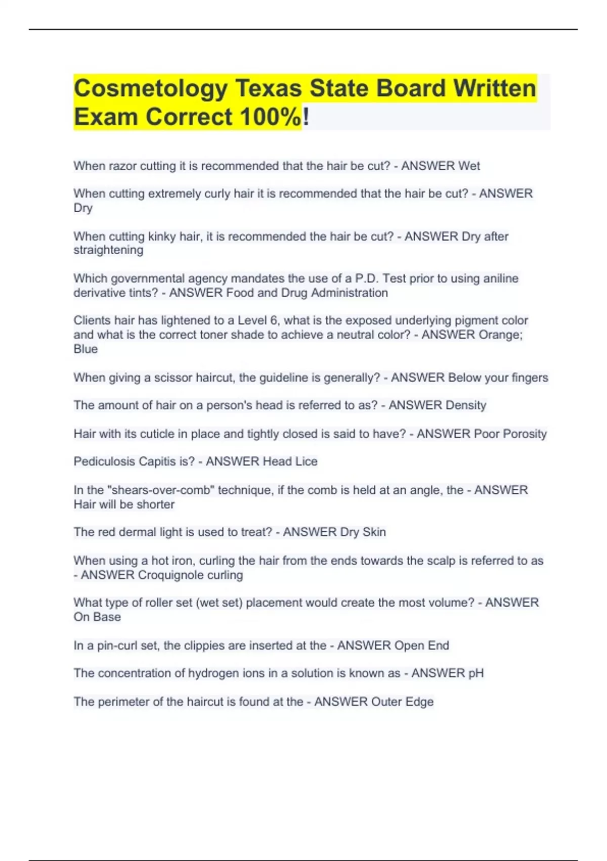 Cosmetology Texas State Board Written Exam Correct 100%!