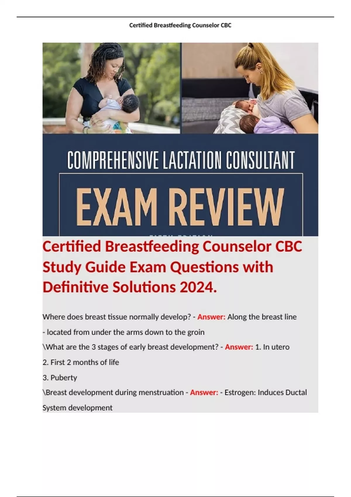 1 Exam (elaborations) Certified Breastfeeding Counselor CBC Study Guide Exam Questions with Definitive Solutions 2024. 2 Exam (elaborations) Certified Breastfeeding Counselor Exam Questions with Definitive Solutions Updated 2024.Terms like: Where does breast tissue normally develop? - Answer: Along the breast line - located from under the arms dow