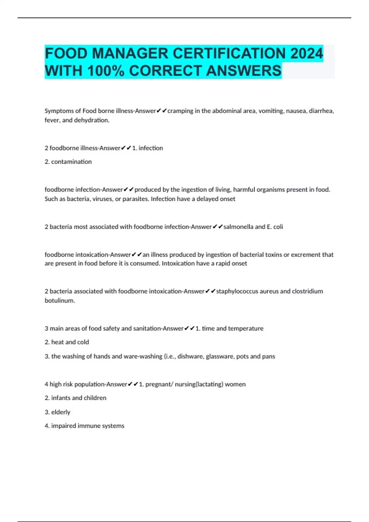 FOOD MANAGER PRACTICE EXAM 2024 WITH 100% CORRECT ANSWERS FOOD MANAGER PRACTICE EXAM 2024 WITH 100% CORRECT ANSWERS