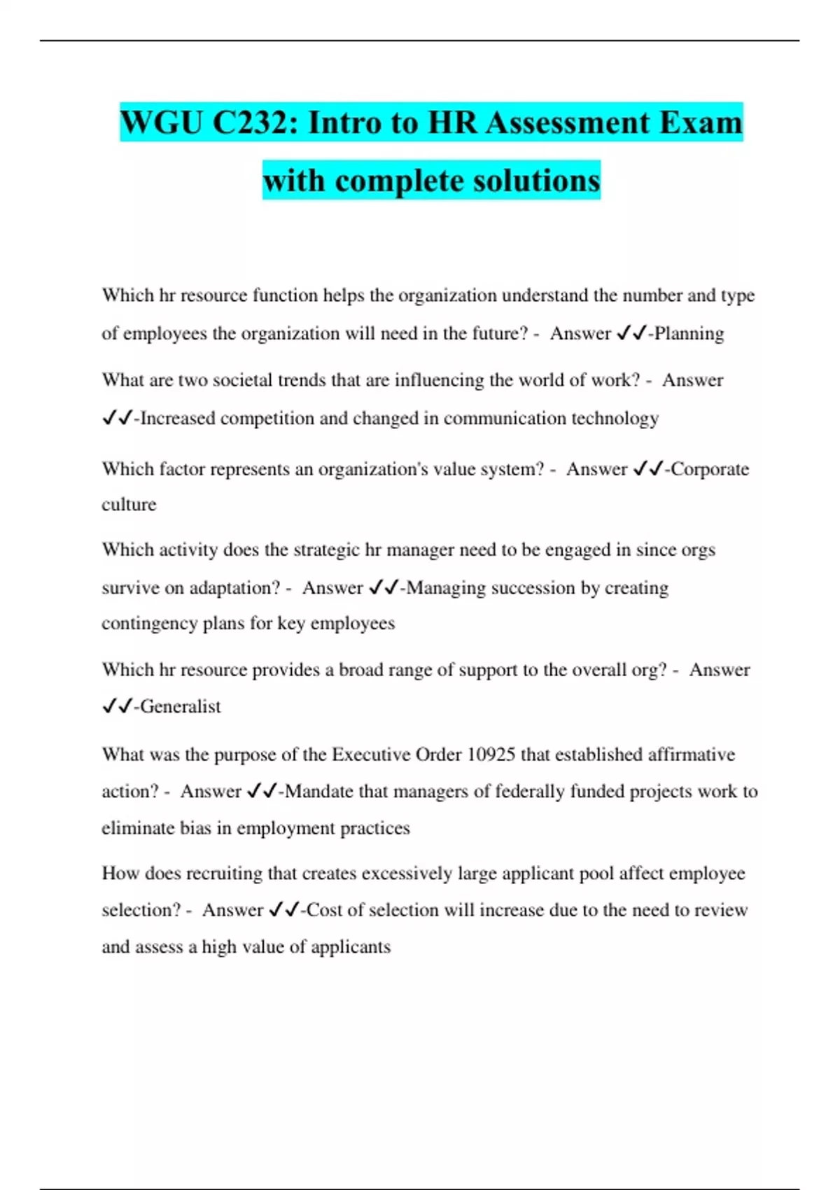 WGU C232: Introduction to Human Resources Assessment Questions & Answers