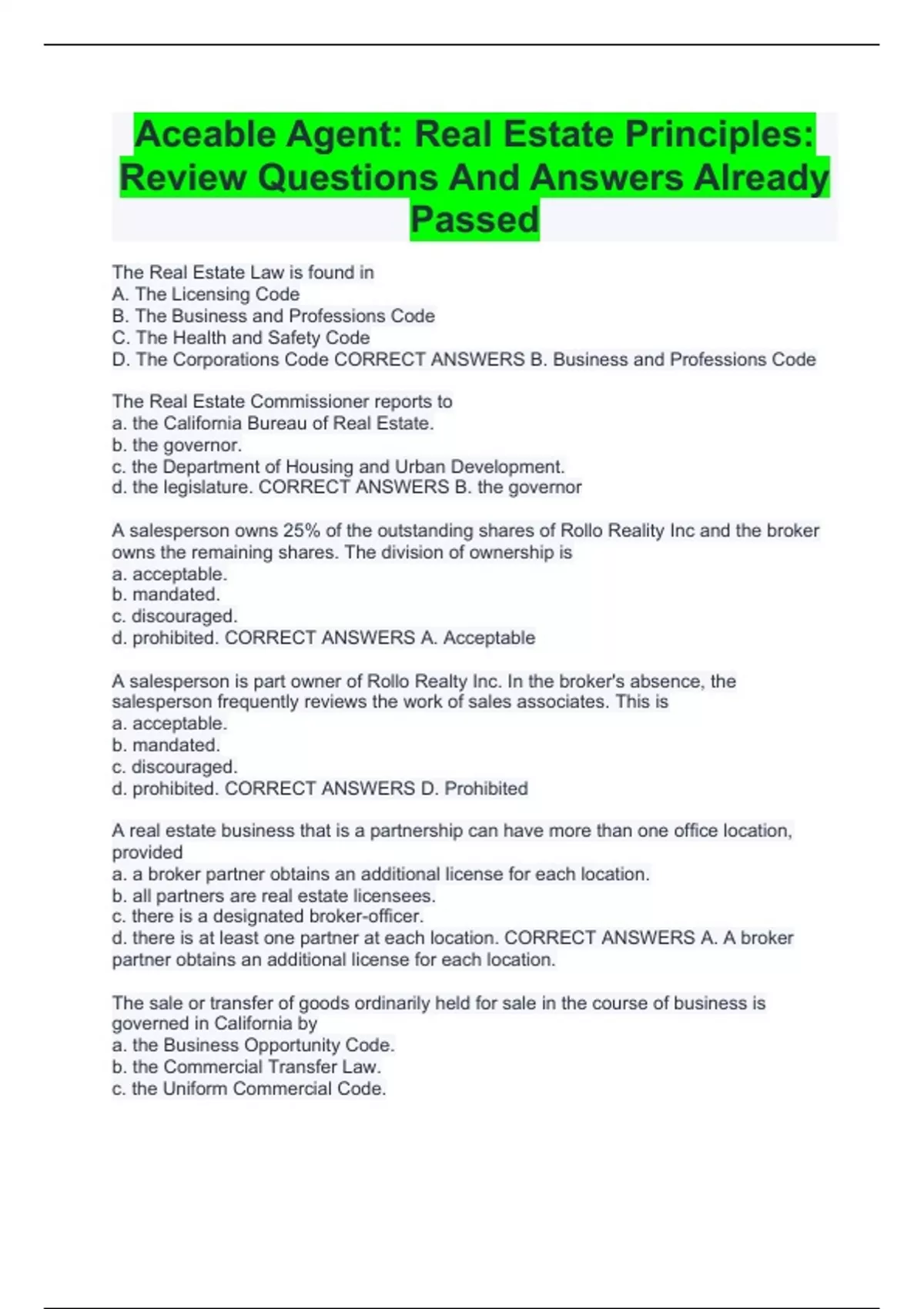 Aceable Agent: Real Estate Principles: Review Questions And Answers Already Passed Aceable Agent Texas Real Estate Principles I Test With Complete Solutions A+ Graded Aceable Agent Exam Questions With Complete Solutions To Score A+