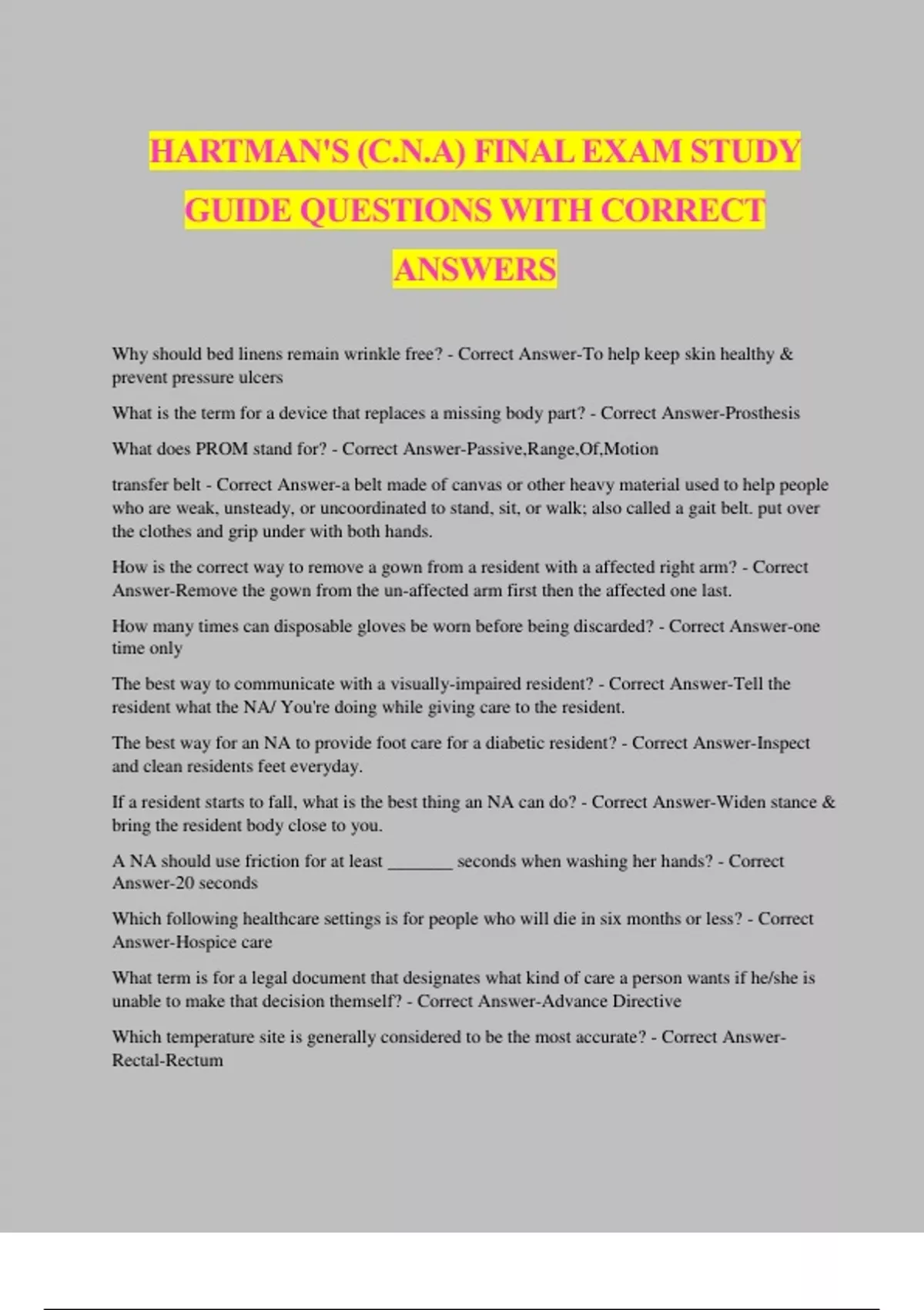 HARTMAN'S (C.N.A) FINAL EXAM STUDY GUIDE QUESTIONS WITH CORRECT ANSWERS