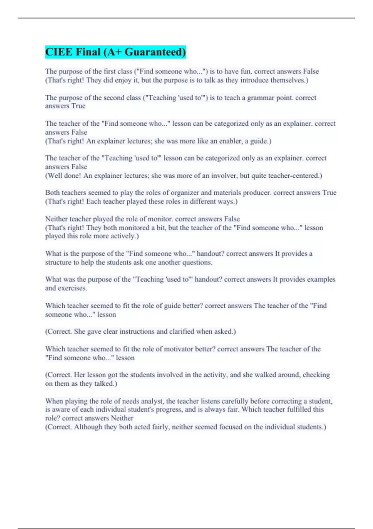 CIEE TEFL Certification (100% Verified) TELF Certification. (100% Error-free Answers) TEFL (100% Errorless Answers) TEFL (100% Verified Solutions) TEFL - Unit 2 (100% Accurate Answers) TEFL (100% Correct Answers) TEFL GLOSSARY (ALL CORRECT) TEFL Certification: Unit 2 (A+ Graded) TEFL Chapter 1- Role of the Teacher (A+ Graded Already) TEFL course (1