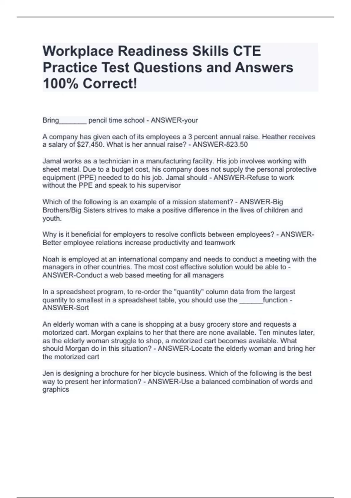 Workplace Readiness EXAM BUNDLE(COMPLETE PACKAGE) Questions and Answers 100% Correct!Workplace Readiness EXAM BUNDLE(COMPLETE PACKAGE) Questions and Answers 100% Correct!Workplace Readiness EXAM BUNDLE(COMPLETE PACKAGE) Questions and Answers 100% Correct!Workplace Readiness EXAM BUNDLE(COMPLETE PACKAGE) Questions and Answers 100% Correct!Workplace