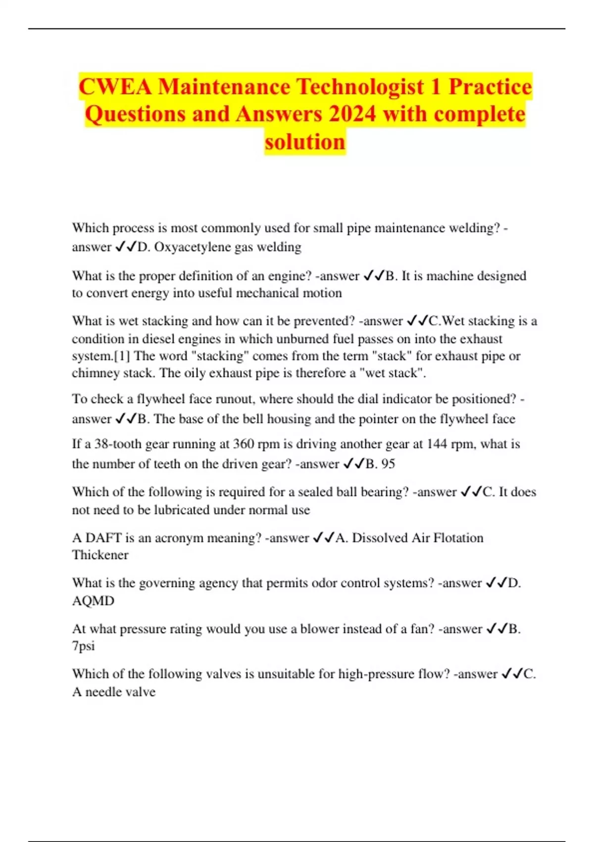 CWEA Maintenance Technologist 1 Practice Questions and Answers 2024 with complete solution
