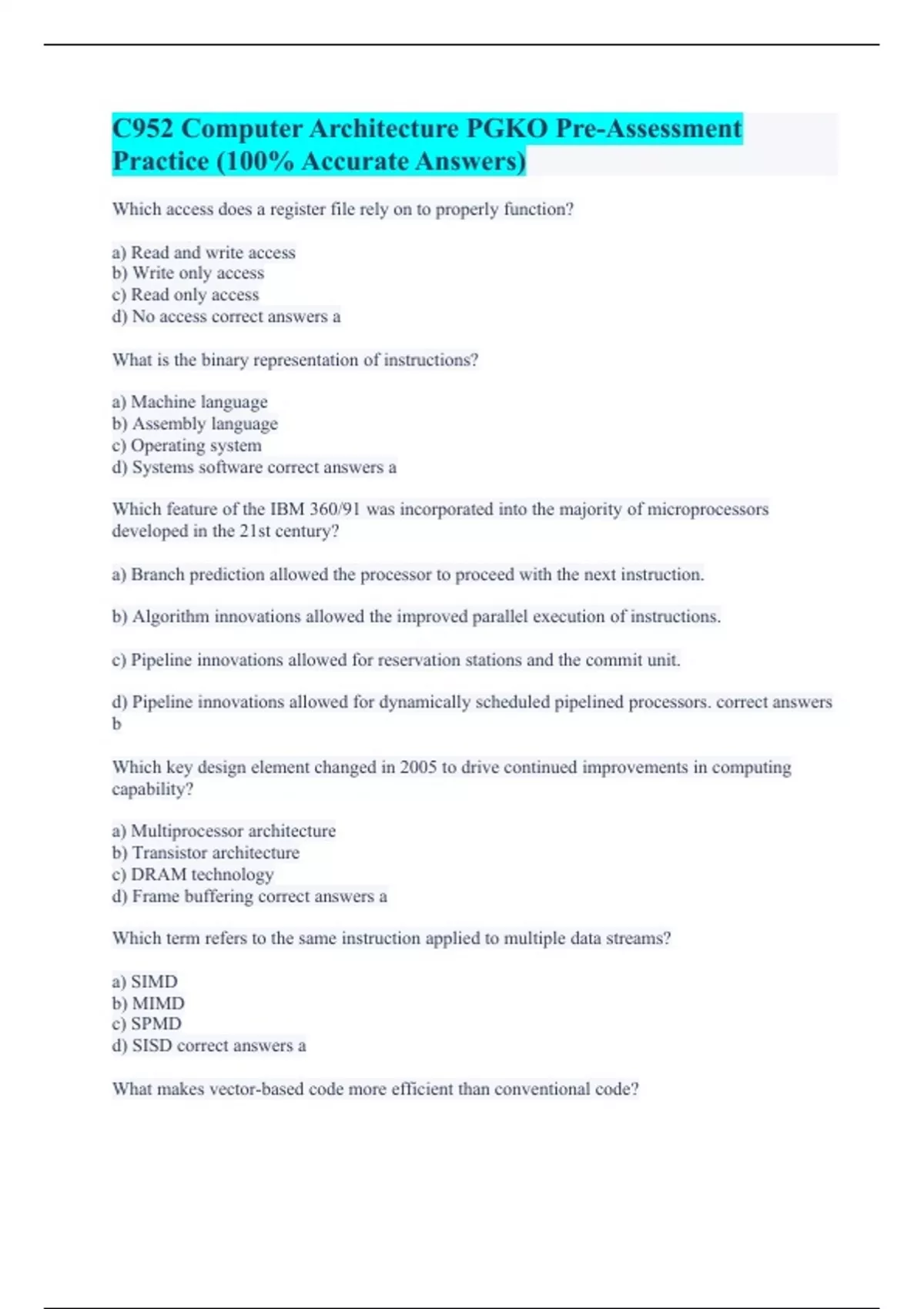 WGU C952 (with Accurate Answers 100%) C952 Computer Architecture PGKO Pre-Assessment Practice (100% Accurate Answers) C952 - Computer Architecture (with Complete Solutions) Computer Architecture WGU C952 (100% Errorless Answers) WGU C952 (A+ Guaranteed) WGU C952 Terms to Know (All Correct) WGU C952 Vocab (All Accurate)