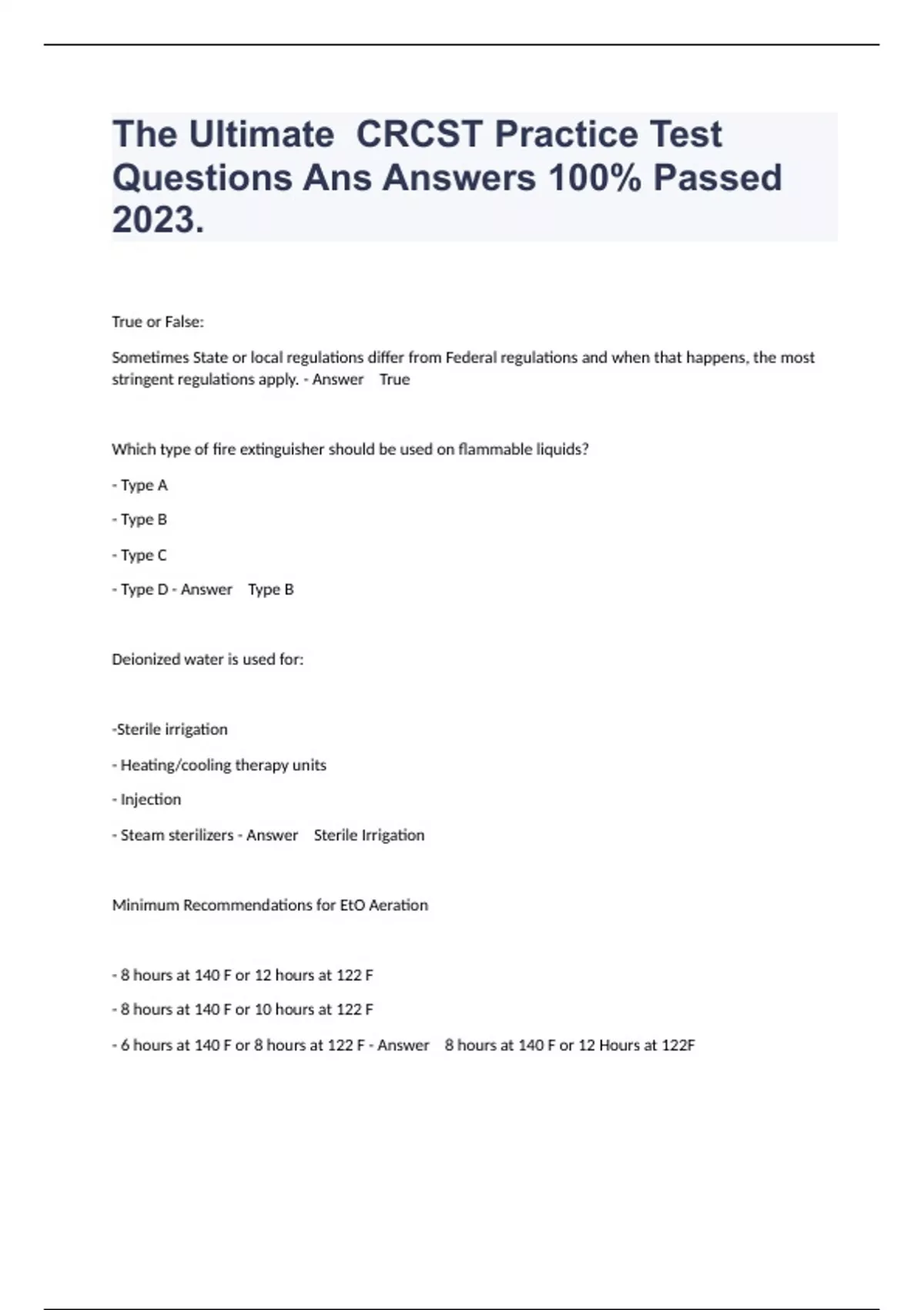 1 Exam (elaborations) CRCST Study Guide Test Questions And Answers 100% passed . 2 Exam (elaborations) CRCST 8TH EDITION - FINAL PREP EXAM AND CORRECT ANSWERS GRADED A+ . 3 Exam (elaborations) CRCST Chapter Questions And correct Complete Solutions . 4 Exam (elaborations) CRCST Exam Test Prep 150 Questions Well Answered 20