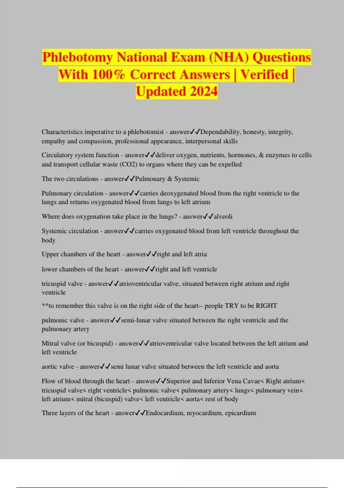 Phlebotomy National Exam (NHA) Questions With 100% Correct Answers | Verified | Updated 2024
