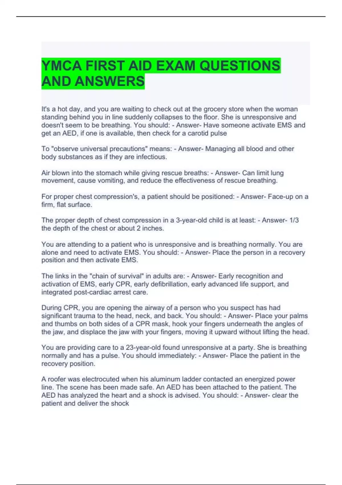 1 Exam (elaborations) YMCA FIRST AID EXAM QUESTIONS AND ANSWERS 2 Exam (elaborations) YMCA CPR Exam Questions and Answers-Graded A 3 Exam (elaborations) YMCA CPR EXAM II QUESTIONS AND ANSWERS 4 Exam (elaborations) YMCA CPR EXAM 3 QUESTIONS WITH CORRECT ANSWERS 5 Exam (elaborations) Standard First Aid, CPR, and AED Pre-Test Examination Questions