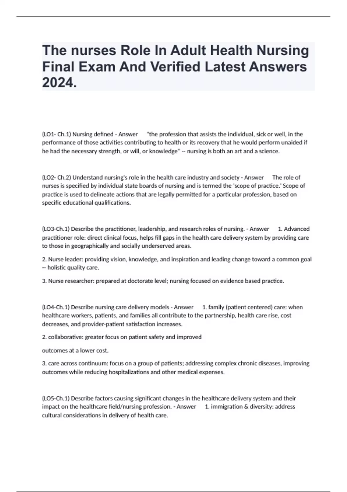 1 Exam (elaborations) Adult Health 1 Final Exam With UpdatedVerified Answers 2024. 2 Exam (elaborations) Adult Health 1 Practice Questions With Complete Solutions 2024. 3 Exam (elaborations) Adult Health 1 Test Exam Questions With Verified Correct Answers 2024. 4 Exam (elaborations) Adult Health 1 Test - Practice Questions With Complete Answers