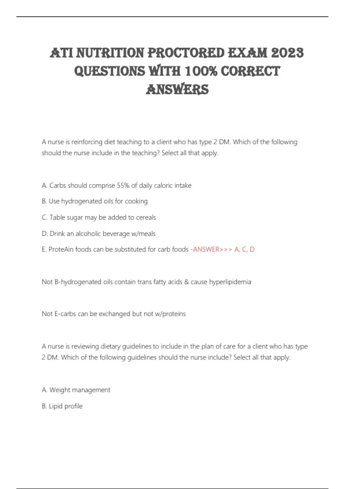 ATI Nutrition Proctored Exam 2023 Questions with 100% correct answersATI Nutrition Proctored Exam 2023 Questions with 100% correct answers