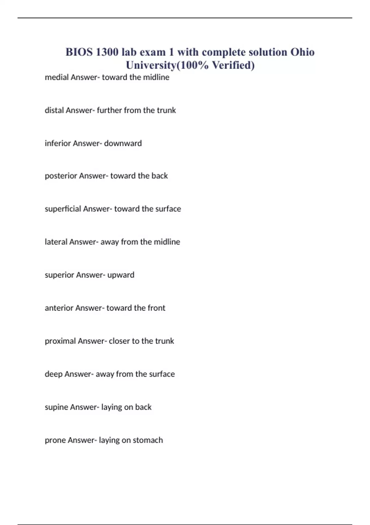 Bios 1300 Cumulative Final Exam |214| Questions With Complete Solution/BIOS 1300 Anatomy Lab Final Exam well solved/BIOS 1300 Final Exam (Nielsen) OHIO University questions with 100% verified answers/BIOS 1300 FINAL EXAM |151| QUESTION WITH COMPLETE SOLUTION