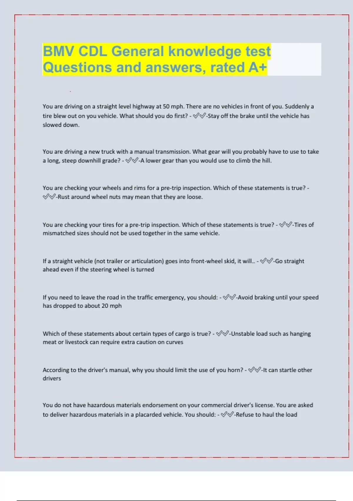 CDL Exam Questions & Answers. VERIFIED./ LATEST UPDATES FOR 2024/ 2025 EXAMS PREDICTIONS