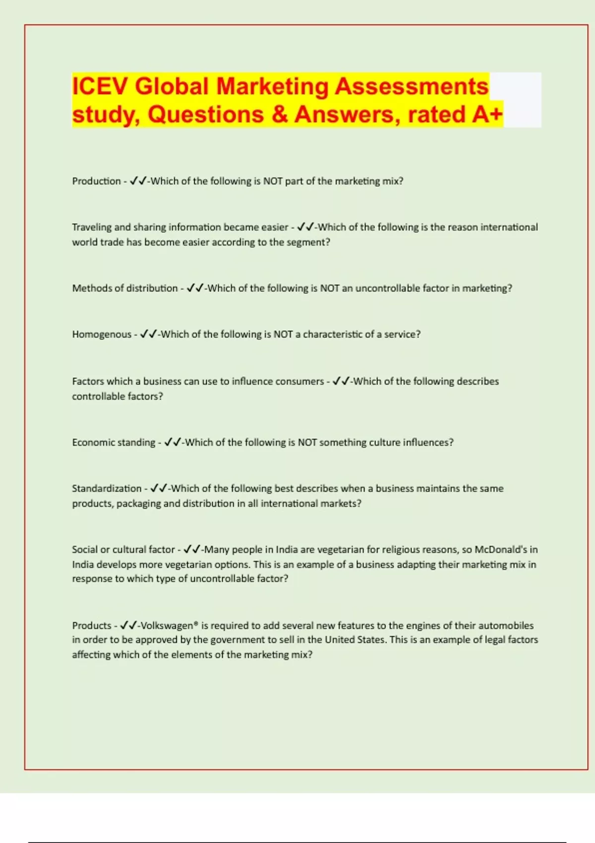 ICEV Global Marketing Assessments study, Questions & Answers, rated A+/ latest 2024/25 exam prediction paper/ APPROVED.
