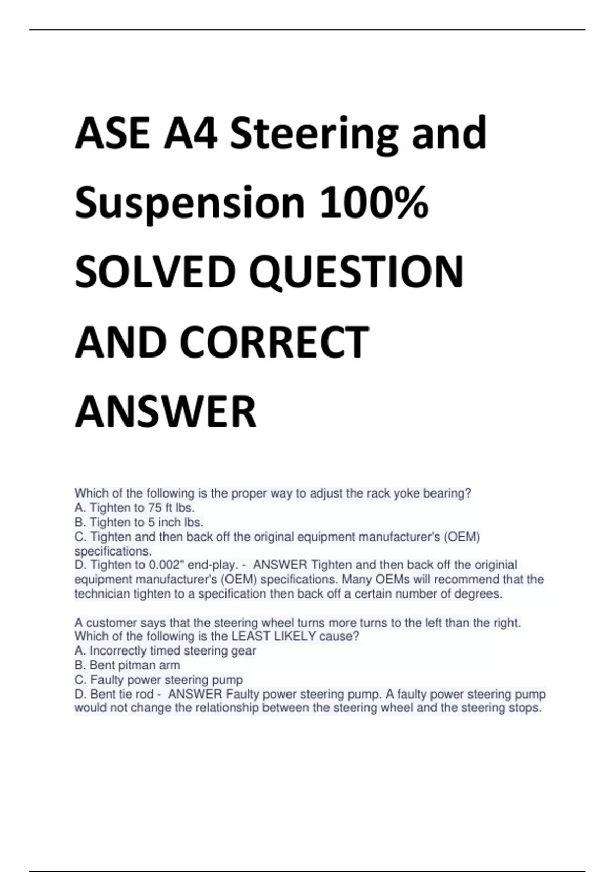 BUNDLE FOR ASE A4 Steering and Suspension 100% SOLVED QUESTION AND CORRECT ANSWER
