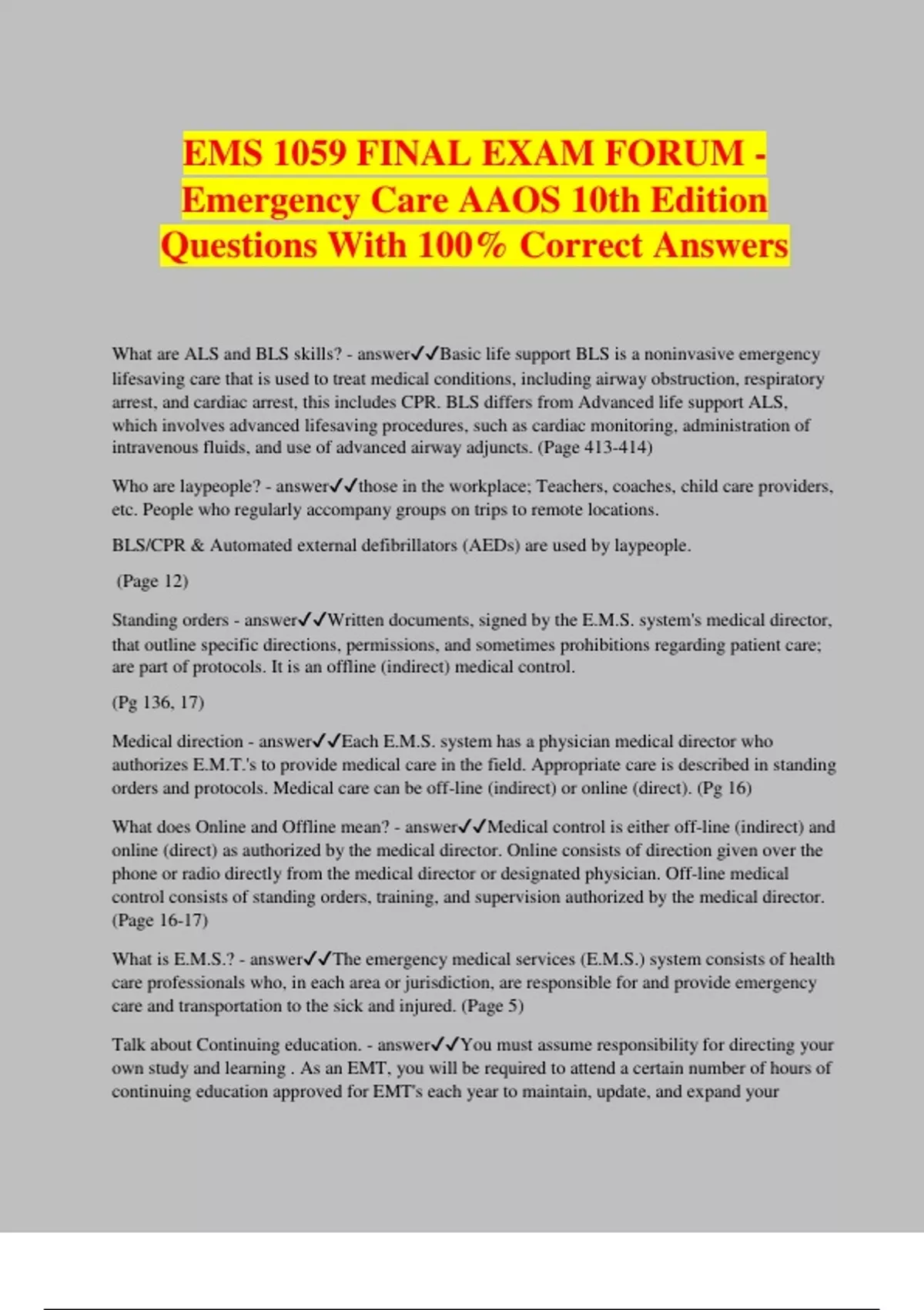 EMS 1059 FINAL EXAM FORUM - Emergency Care AAOS 10th Edition Questions With 100% Correct Answers