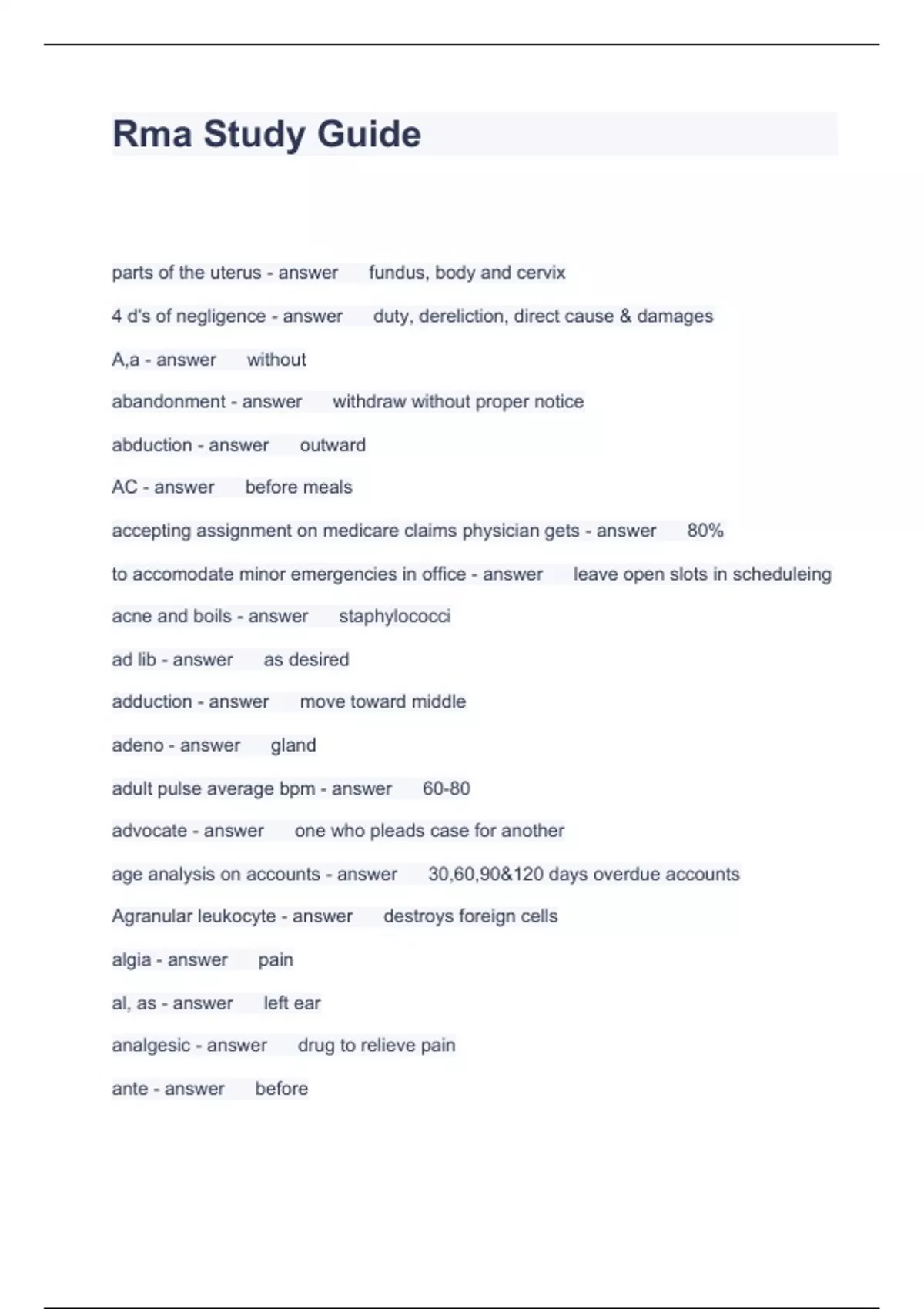 Exam (elaborations) Medical Terminology (RMA Exam) Questions and Answers Latest Updated 2024 Exam (elaborations) RMA EXAM 2024 QUESTIONS WITH CORRECT ANSWERS Exam (elaborations) RMA Exam Questions and Answers Accurate Exam (elaborations) RMA Final Exam Questions and Answers Fully solved Exam (elaborations) RMA GUIDE 1 QUESTIONS AND ANSWERS