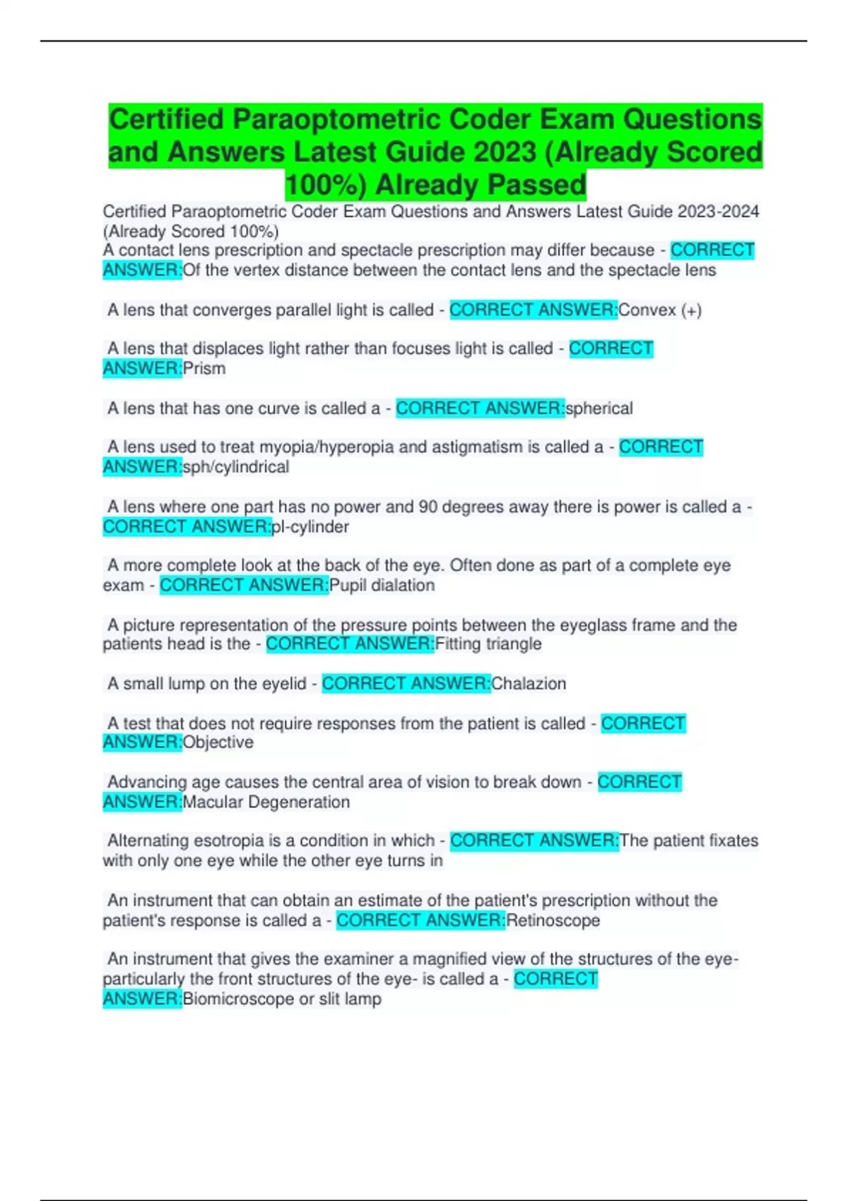 Certified Paraoptometric Coder Exams 3 VERSIONS BUNDLED TOGETHER