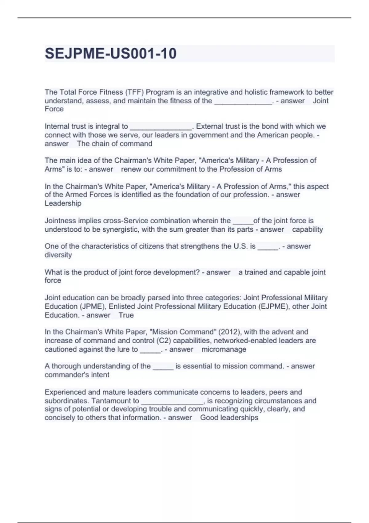 Exam (elaborations) EJPME 1 - National Military Command Structure Pre-Test Questions and Answers Graded A Exam (elaborations) EJPME II Joint Operations pretest Questions with correct Answers 2024 Exam (elaborations) EJPME II Module 3 Post test Questions and Answers 2024 Exam (elaborations) EJPME II Module 5 Joint Intelligence Questions and A